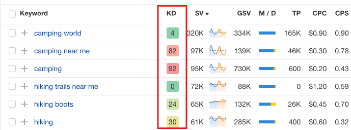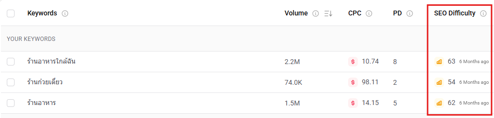 Keyword Difficulty (KD) คือความยากของ Keyword เป็นตัวเลขในการชี้วัดอย่างหนึ่งว่า Keyword นั้นๆ มีการแข่งขันสูงหรือมีการแข่งขันต่ำ (ยิ่งตัวเลขสูงก็ยิ่งมีการแข่งขันสูง ยิ่งตัวเลขต่ำก็ยิ่งมีการแข่งขันต่ำ) และ Keyword นั้นๆ ที่เราทำ จะมีโอกาสติดอันดับบน Search Engine ได้มากน้อยแค่ไหน