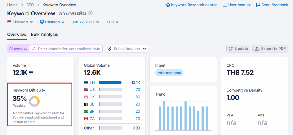 • จุดเด่น: เป็นอีกหนึ่งเครื่องมือ All-in-One ที่มีประสิทธิภาพสูงมาก เพราะมีฟีเจอร์ “Keyword Magic Tool” และ “Keyword Overview” ที่ให้ค่า KD พร้อมข้อมูลคู่แข่งโดยละเอียด และสามารถวิเคราะห์ “Personal Keyword Difficulty” (PKD) ที่ประเมินโอกาสในการติดอันดับของเว็บไซต์คุณโดยเฉพาะ ถือว่าดีมากสำหรับการวางแผนกลยุทธ์